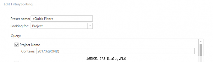 The % is a wildcard so that any text can occur between the 2017 beginning for the project name and the (BOND) ending of the project name. When this filter is applied the project list will only show Bond work from 2017.